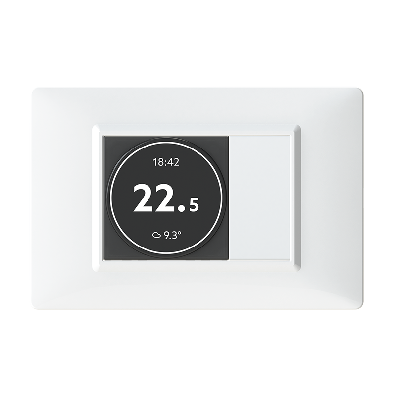 Two modules wide – for comprehensive systems management. In addition to standard chronothermostat functions, SWIPE also serves as a smart home control hub. It lets you manage your heating and cooling systems, as well as activate preset routines, such as turning all connected devices on or off. It also functions as a wall-mounted weather station.