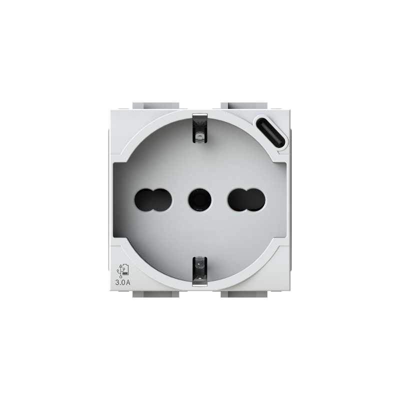 Electrical socket P40 + Flush-mounted USB Power Supplies 3.0 2 modules – P40 1 Schuko or one two-pin/bipasso socket; 2P+E 16 A 250 V AC; 2P+E 10/16 A 250 V – USB 3.0 Power Supply 250 V AC 50/60 Hz – 1 output Type C 5 V DC 3.0 A