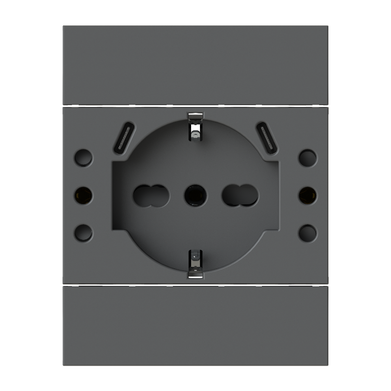 USB P503 is a compact, flush-mounted power strip designed to optimize space. 5 different electrical sockets and 2 USB Type-C outputs in a single product, installable in a traditional 3-module 503 box.