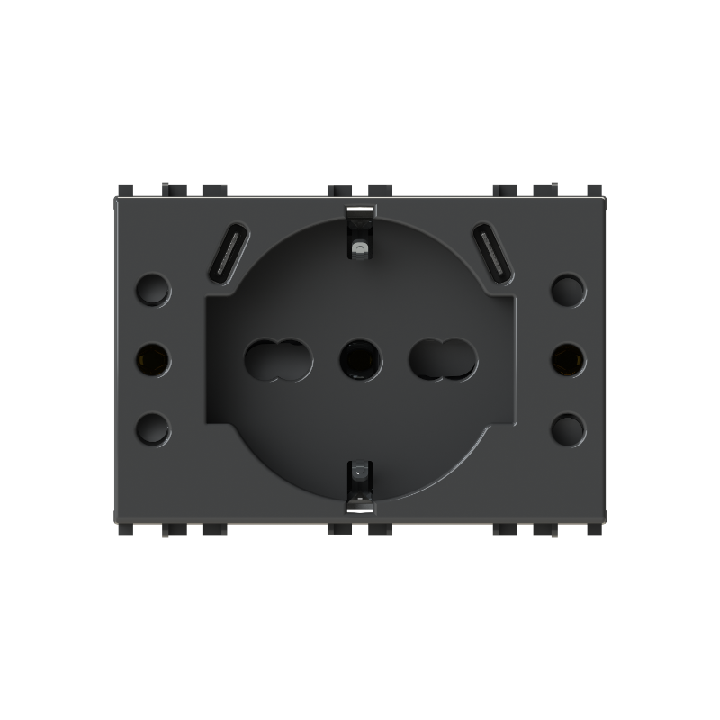 Presa elettrica P503 + 2 Alimentatori USB 3.0 2 moduli – P503 1 schuko e 2 bipasso o 3 bipasso; 2P+T 16 A 250 V AC; 2P+T 10/16 A 250 V – Alimentatore USB 3.0 A 250 V AC 50/60 Hz – 2 uscite tipo C 5 V DC 3.0 A
