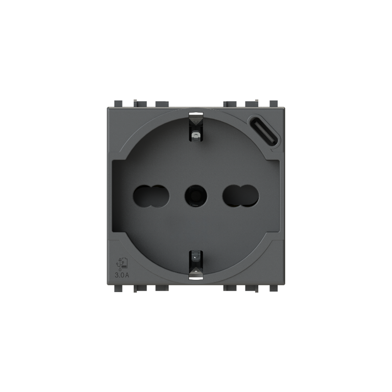 Presa elettrica P40 + Alimentatore USB 3.0 2 moduli – P40 1 schuko o una bipasso; 2P+T 16 A 250 V AC; 2P+T 10/16 A 250 V – Alimentatore USB 3.0 A 250 V AC 50/60 Hz – 1 uscita tipo C 5 V DC 3.0 A